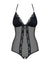 À l’avant, un bandeau de dentelle verticale affine la taille et attire le regard vers un décolleté profond, joliment bordé de motifs romantiques. Au centre, un petit nœud en satin avec un bijou brillant vient souligner la poitrine avec charme. Les bonnets sans armatures offrent un galbe naturel tout en douceur.